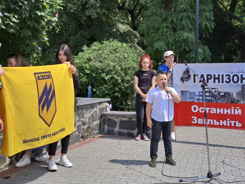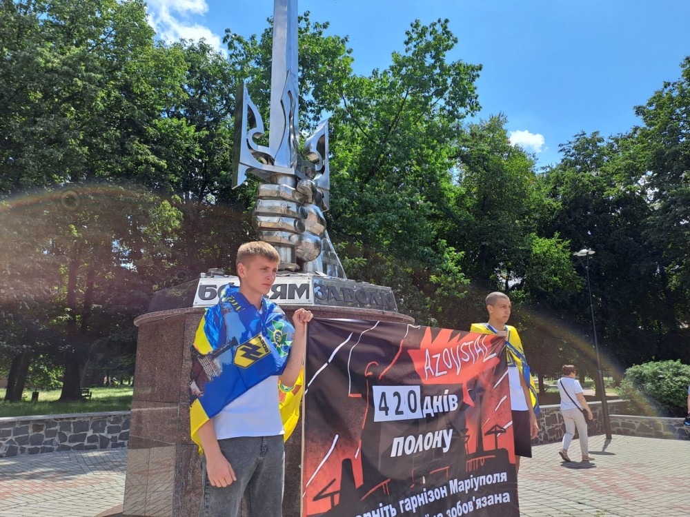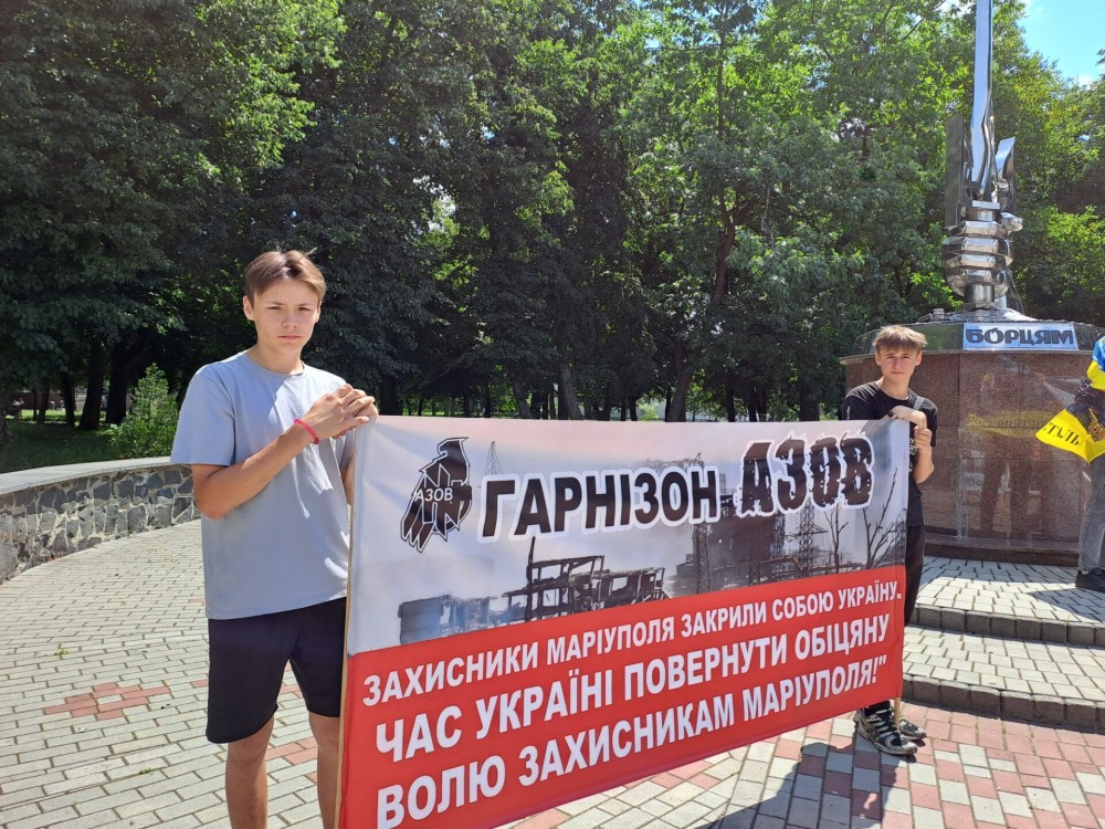 Учасники акції тримали стяги “Азову” та плакати із написами: “Поверніть Героїв”, “Волю захисникам Маріуполя!”, “Незламні Герої маріупольського гарнізону вибороли час для всієї країни”, “Поверніть наших рідних з полону” тощо.