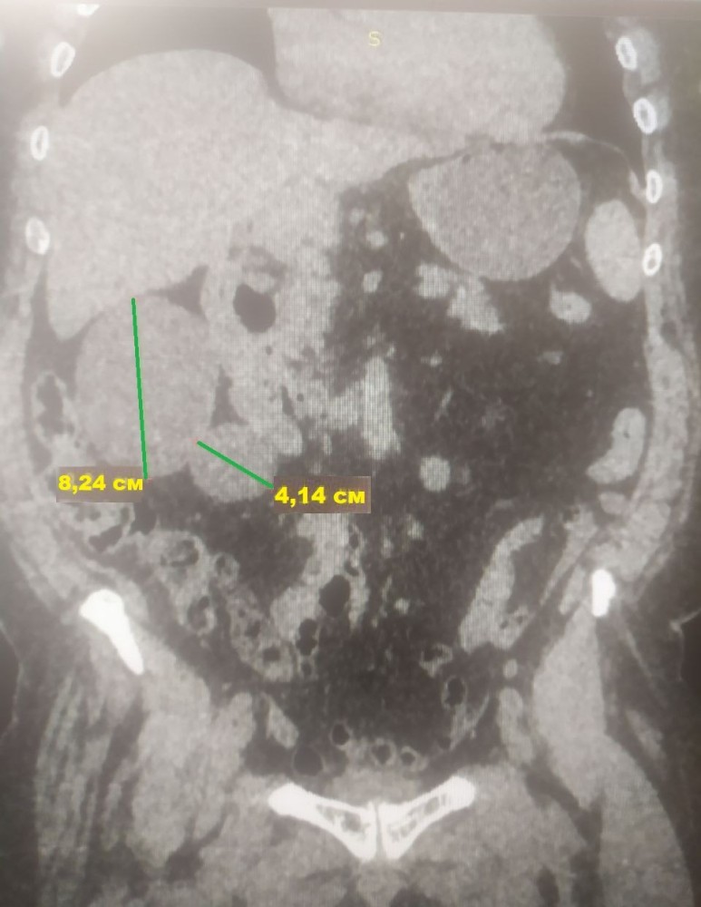 У результаті проведених обстежень лікарі діагностували солітарні кісти правої нирки 8,24 см та 4,14 см в діаметрі (новоутворення з тонкими стінками, заповнені рідиною).