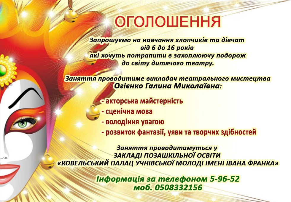 На заняттях, які проводитиме викладач Огієнко Галина Миколаївна, дітки зможуть навчитись акторській майстерності, опанувати сценічну мову, розвити фантазію, уяву та творчі здібності. За додатковою інформацією звертайтесь за телефоном 5-96-52, моб. 0508332156.