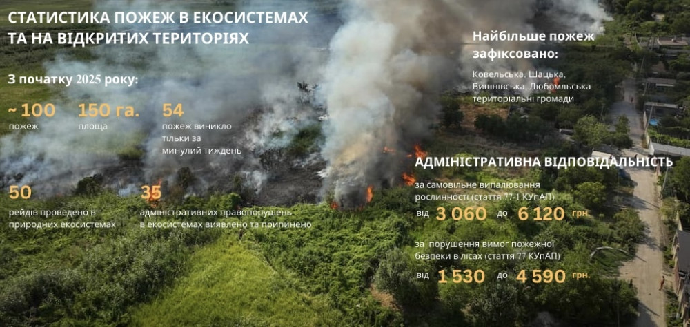Працівники ДСНС систематично беруть участь у складі рейдових груп по всій території Ковельського району та виявляють, зокрема, за допомогою БпЛА, осередки загоряння та факти випалювання сухої рослинності. Так, з початку року надзвичайники здійснили 50 таких перевірок в екосистемах та притягнули до адміністративної відповідальності 35 осіб.