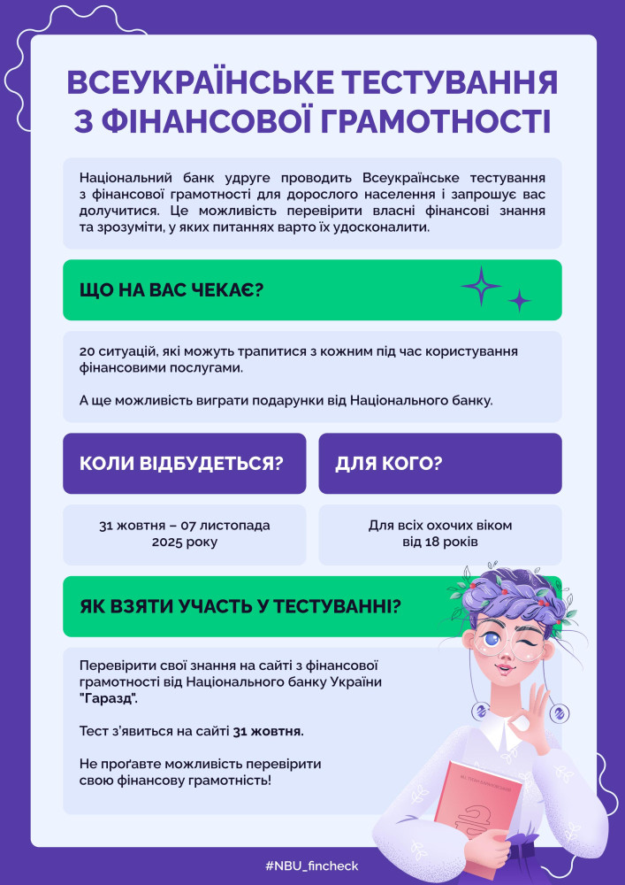 З 31 жовтня до 7 листопада 2025 року Національний банк України проводить Всеукраїнське тестування з фінансової грамотності для дорослого населення. Ініціатива приурочена до Всесвітнього дня заощаджень, який традиційно відзначається щороку 31 жовтня.