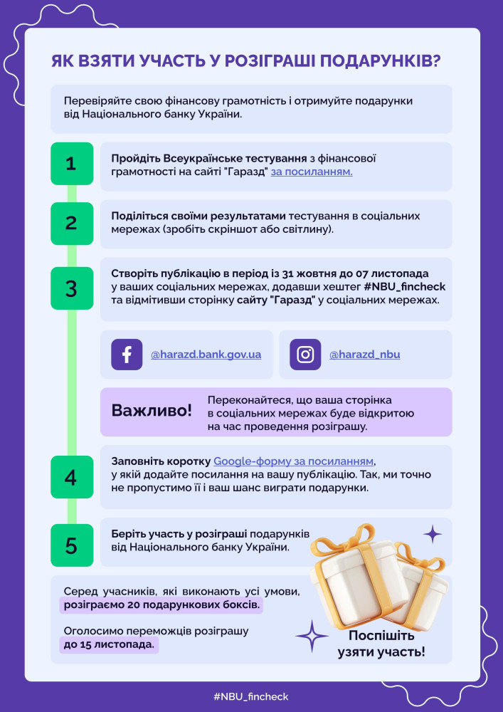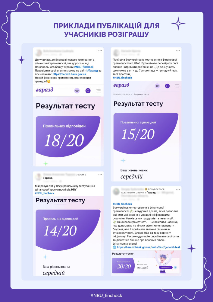 Учасникам пропонують відповісти на 20 запитань, кожне з яких відображає реальні життєві ситуації, з якими стикаються споживачі фінансових послуг.Тест не лише допоможе оцінити рівень знань, а й виконує навчальну функцію — надає пояснення та практичні рекомендації для поліпшення фінансових навичок.