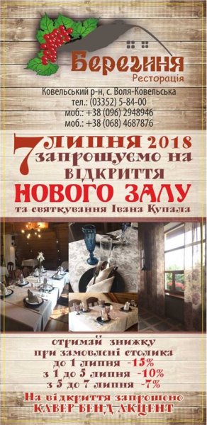 А 7 липня ресторація "Берегиня" планує чудове свято: відкриття нового залу у поєднанні із святкуванням Івана Купала, у якому буде втілено українські традиції.
