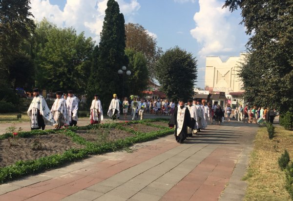 Від пам'ятника Тарасу Шевченку урочистою ходою під супровід муніципального духового оркестру, з державними прапорами України, колона пройшла до меморіалу Слави.